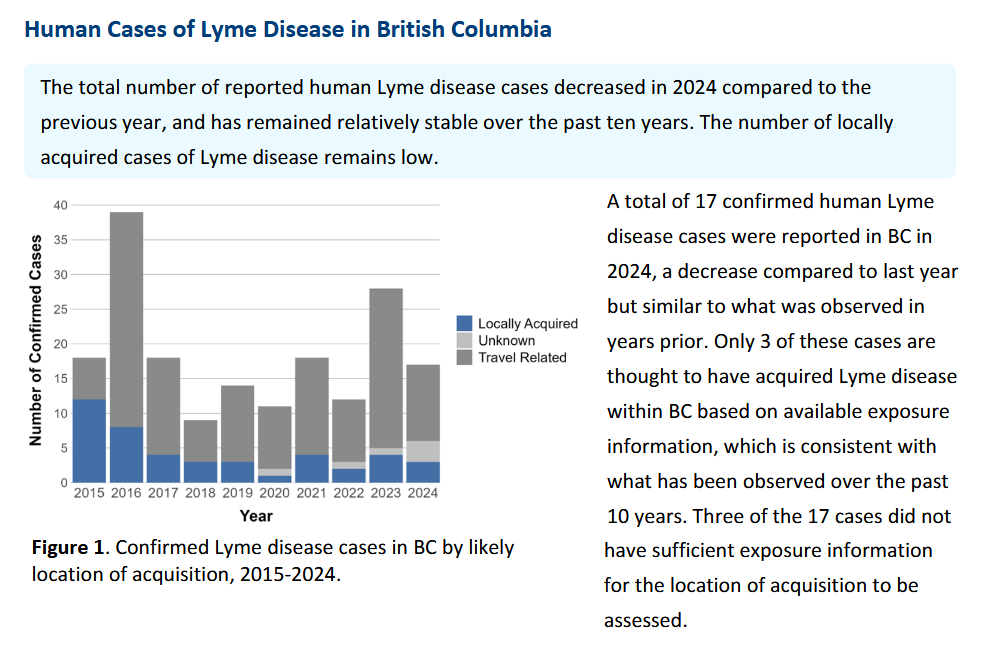 | BCCDC (British Columbia) | Monitors Lyme disease; distinguishes travel vs locally acquired | Southern BC; locally acquired cases are rare but rising | Tick bite prevention, diagnostic info, reporting, public education on local risk areas |